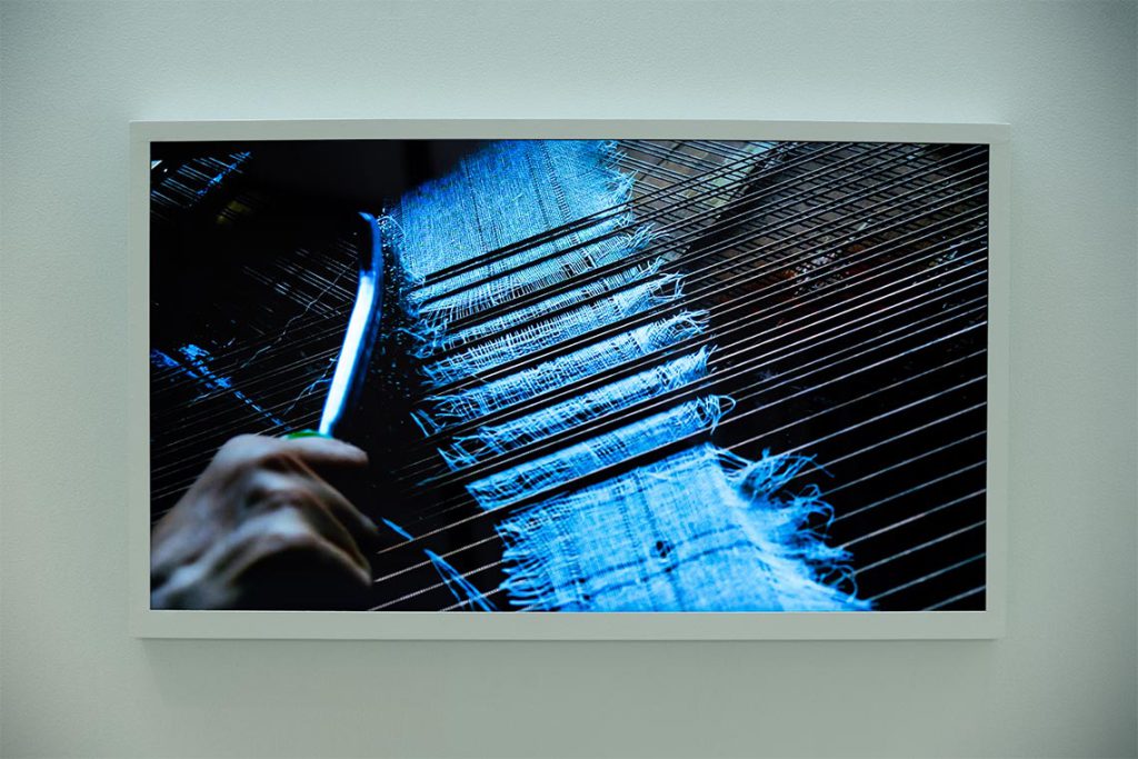 Pale green walls embrace the space. The L-shaped gallery opens onto a glass façade overlooking a solitary ghaf tree, grounding the works in the enduring presence of the desert. The only sounds are mechanical whispers, the hum of the air conditioning and the scraping sound from Conditioning the Knot (2022), a film where repetition becomes a ritual. A hand moves slowly across taut strings, unravelling fragile strips of fabric woven tightly between them. The act of unmaking is repeated, over and over – until the act itself becomes a rhythm. The sound of screeching fabric, although subtle, might unsettle those sensitive to sound, a raw edge of tension caught in the air.