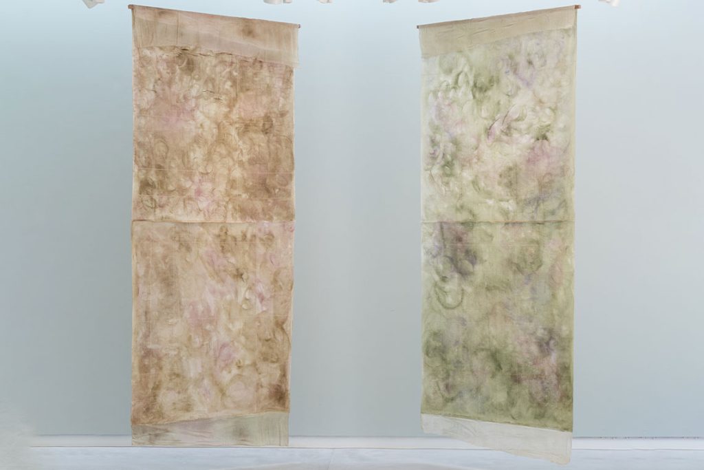 A similar sense of lingering weight forms straining under the pressure of their own repetition, runs through the artist’s earlier exploration of memory and materials. In absence we forget (2015), she presses a cement rectangle multiple times into the fabric, leaving stains that feel like the residue of something already adapting and taking shape. Al Dhaheri later transforms an installation view of that piece into To Revisit (2016), a slow unmaking in print form, where the image lightens and thins with every repetition, as though memory itself were fraying at the edges. The dwindling trace becomes the seed for To Preserve (no.2) (2017), where the fabric hangs steadily, its edges subtly shifting and overlapping, never quite fixed.