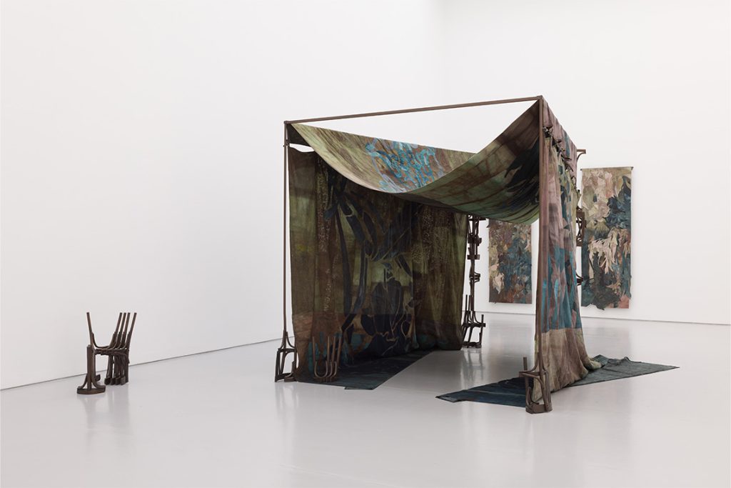 This tension between scale and intimacy becomes the exhibition’s structuring principle. Where many emerging artists might attempt to fill the gallery’s soaring volume, Jaouda does something braver: she brings the ceiling down. At the centre of the space sits The iris grows on both sides of the fence (2025), a hand-stitched Khayamiya tent produced in collaboration with master craftsmen from Cairo’s historic street of tentmakers. With its asymmetrically draped panels converging toward the far end, the structure has an unexpectedly utilitarian quality – something closer to field equipment than ceremonial textile.