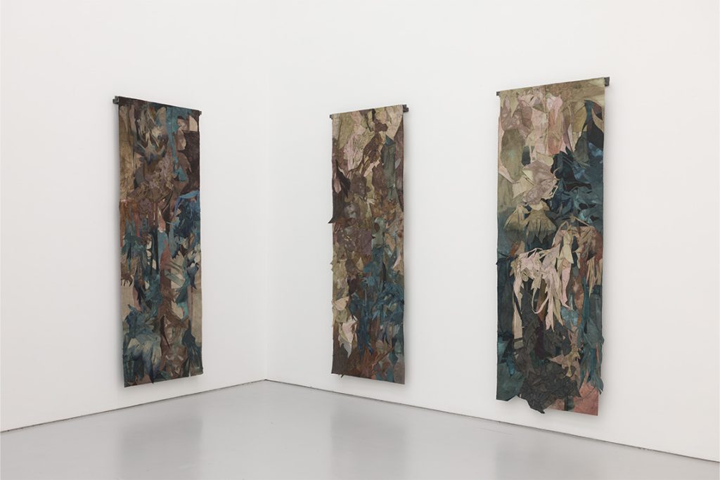 The wall-based textile works prove more elusive. Suspended inches from the gallery surface, these vertical tapestries contain gaps and perforations that reveal the complexity of their construction only to those willing to look closely. Without backlighting to announce their intricate layering, the works demand careful attention – you must move around them, peer at their edges, trace the shadows between fragments. This resistance to immediate legibility reinforces the exhibition’s hierarchy of experience: the tent rewards those who enter, while the wall works demand sustained looking.